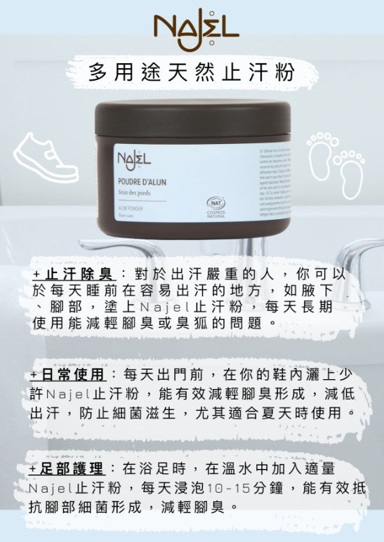 在穿上襪子和鞋子之前,亦可將 Najel止汗粉直接灑在鞋子內或腳上以減低腳汗排出,同時減輕腳臭。建議在夏季赤腳穿的鞋子中也可使用此法。