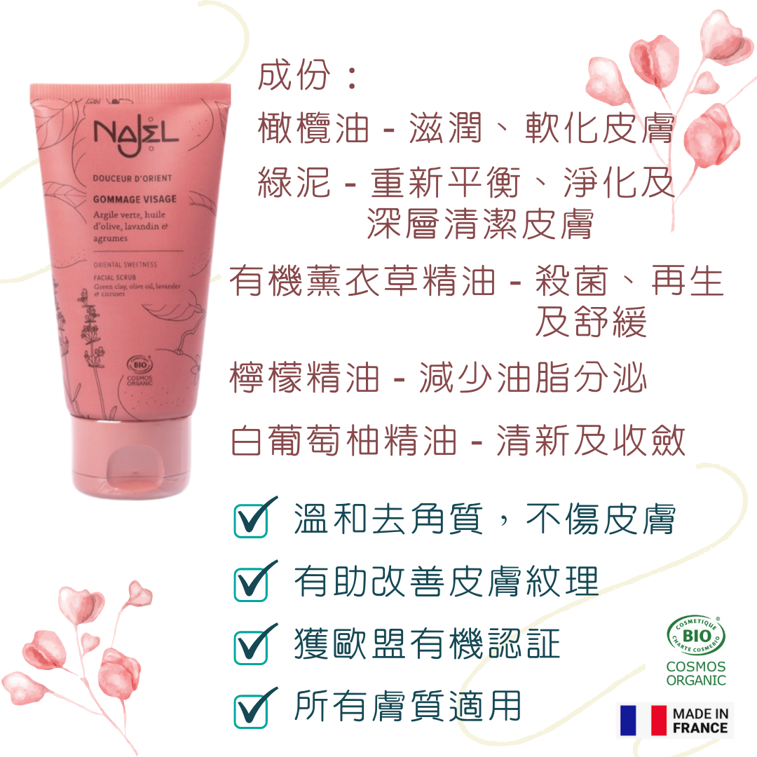 Najel面部磨砂膏成份獨特-含有有機橄欖油、綠泥、橄欖石粉及精油,賦予其適合所有皮膚類型的吸收、去角質和保濕的特性。